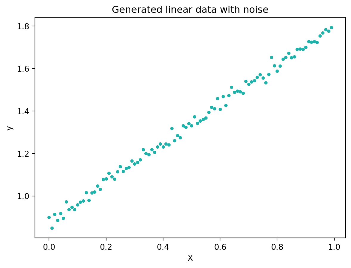 bias + weight * X), а також додайте трохи випадкового шуму (наприклад,torch.randn()). При цьому самостійно оберіть початкове значення генератора випадкових чисел.- Випадково оберіть