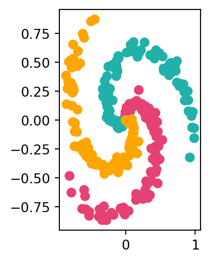 import numpy as npimport matplotlib.pyplot as pltfrom matplotlib.colors import ListedColormapred_pink ="#e64173"turquoise ="#20B2AA"orange ="#FFA500"np.random.seed(73)1N =1002D =23K =34X = np.zeros((N*K,D))5y = np.zeros(N*K, dtype='uint8')for j inrange(K): ix =range(N*j,N*(j+1))6 r = np.linspace(0.0,1,N)7 t = np.linspace(j*4,(j+1)*4,N) + np.random.randn(N)*0.2 X[ix] = np.c_[r*np.sin(t), r*np.cos(t)] y[ix] = jplt.figure(figsize=(1.9,3))plt.scatter(X[:, 0], X[:, 1], c=y, s=40, cmap=ListedColormap([red_pink, turquoise, orange]))plt.show()